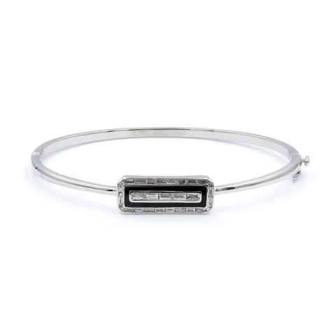 Treat yourself to our elegant gold bangle adorned with a pop of black enamel. Five baguette diamonds surrounded by rich gold and black enamel with a heavenly halo of baguette diamonds....
