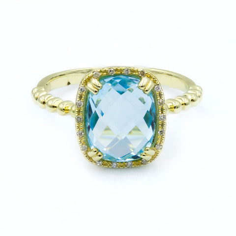 Striking and bold, the Blue Topaz Halo Ring dazzles with a 3.65 carat cushion-cut blue topaz, encircled by a delicate halo of 0.06 carats of diamonds. Crafted in 14K yellow...