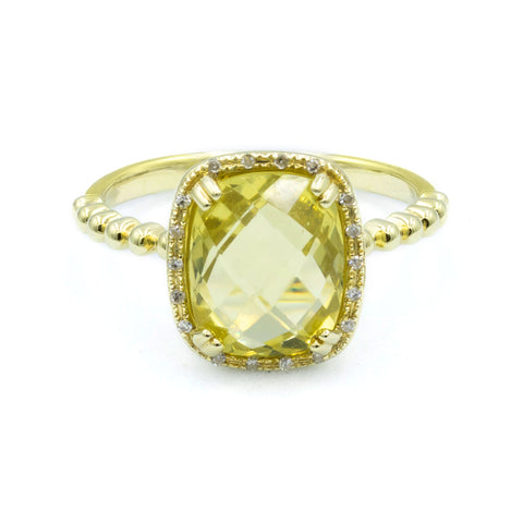 Sunny and radiant, the Lemon Quartz Halo Ring glows with a 2.90 carat cushion-cut lemon quartz, surrounded by a halo of 0.06 carats of diamonds. Set in 14K yellow gold...