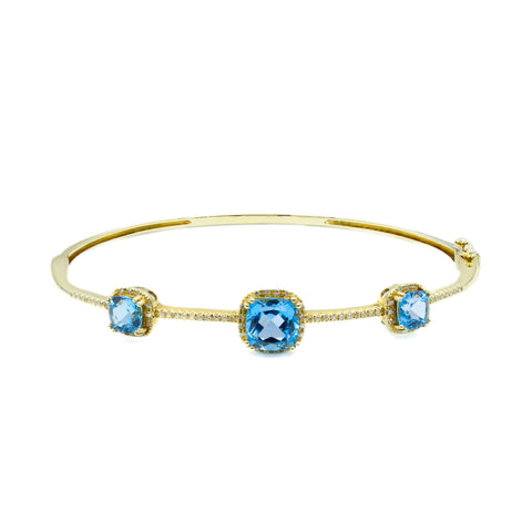 Radiant and refined, this striking bangle features three cushion-cut blue topaz gemstones, totaling 3.68 carats, their vivid sky-blue hue framed by a halo of sparkle. Accented with 0.24 carats of...
