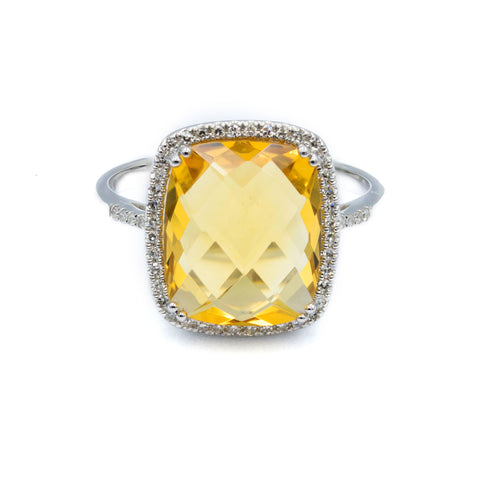 Pure sunshine on your hand. This striking ring features a 4.82ct cushion-cut citrine, framed with 48 natural diamonds for a subtle halo of sparkle. Set in polished 14k white gold,...