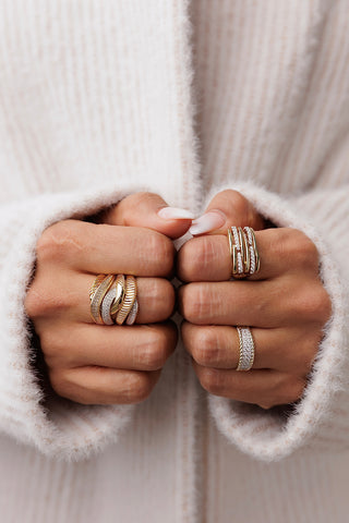 Stacked perfection in one design. This 14k yellow gold ring is crafted with multiple interlaced bands, highlighted by 28 diamonds totaling 0.33ct. Chic, bold, and versatile, it’s the ring that...