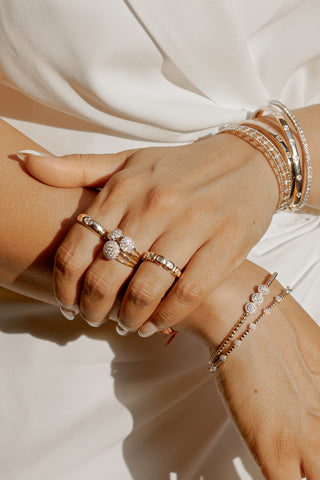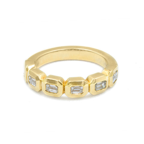 Trendy yet classic and timeless and a perfect stackable ring.  Available in 2 styles.  Materials: 0.87 cts of bezel set emerald cut diamonds of GH SI quality 14kt yellow gold setting Options: Finger size...