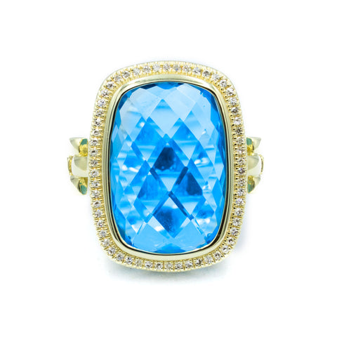 Breathtaking in scale and beauty, the Regal Blue Topaz Halo Ring showcases a 14.30 carat cushion-cut blue topaz framed by 0.18 carats of diamonds. Crafted in 14K yellow gold, it’s...