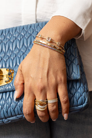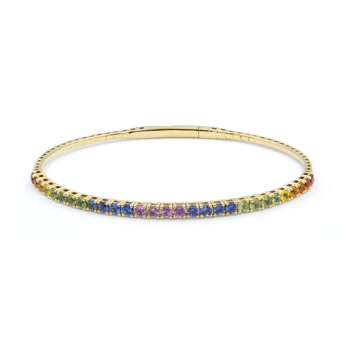 On back order. Please reach out to info@maharanijewels.com or 604.646.4543 to inquire about the exact eta. A vibrant reimagining of a timeless classic, the Rainbow Sapphire Flex Bangle infuses joyful...